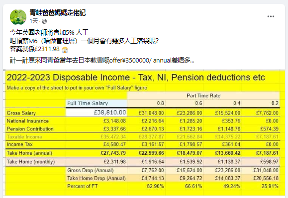 (臉書截圖) 表格顯示,英國全職教師每年的基本薪資為38810英鎊(約合34.6萬港元),除去國民保險、養老金繳款和個人所得稅後,到手收入還剩27743英鎊(約合24.7萬港元)。 “青蛙爸爸媽媽走佬記”“意味深長”地感慨,這樣算下來,在英國做教師的最高薪水,竟然和“青爸”(帖主之一)當年去日本教書的350萬日元(約合18.7萬港元)年薪差不多。 感歎移英後收入“銳減”的帖文一經發出,很快引發不少移英“手足”共鳴。他們紛紛在下方留言感慨於英國“謀生艱難”,工資表上的金額“到手就沒了一半”,這樣“住倫敦會死人”。