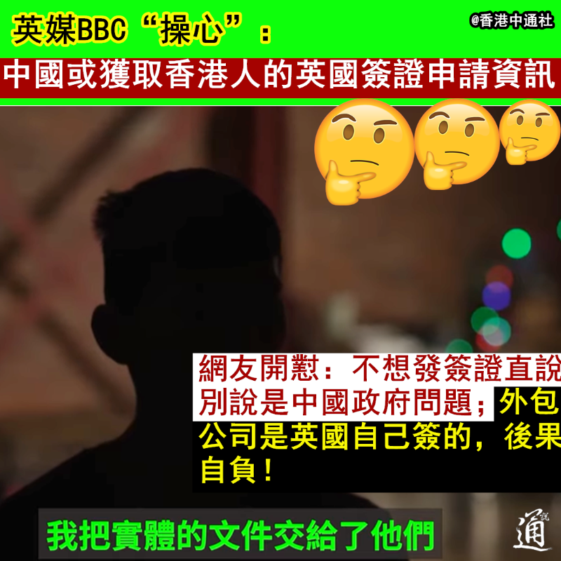 如何不安全?BBC請了幾位人士“現身說法”,包括據稱是香港前公務員的Lee。 Lee聲稱,在“修例風波”期間,他曾轉發一則新聞并寫說“這太可恥了,警察不應該和黑道合作”,其後有人截圖並發給了他的上司。 “我的上司說他可能會就這件事聯絡國安單位。”不過在影片裡,Lee沒有講出事件後續,但就對BBC強調,“那之後我就感到非常不安全。” 感到“不安全”的Lee去了一家由VFS Global運營的英國簽證申請中心......“我把文件交給他們,他們影印了一份,取走我的護照,要我提供生物辨識資料,就是按指紋,然後拍了一張我的照片,之後他們把我的護照留了三周左右。”Lee憶述道。 聽上去再正常不過的簽證申請流程,也讓疑心頗重的港人及戴著有色眼鏡看中國的英媒“聞之色變”,認為這有安全風險。 更好笑的是,渲染了一波“中國政府有可能獲取香港人的英國簽證申請信息”後,BBC又承認,英國內政部發言人表示,中國公司沒有辦法存取簽證申請資料。VFS Global亦回應指,VFS Global全權管理并且擁有儲存著簽證申請者資訊的系統。 也就是說BBC整了出“中國威脅”,可自家政府的表態有點打臉! 在社交平台上,有網友嘲諷英國:“不想(對香港BNO移民)發簽證直說,別說是中國政府問題”。 也有網友直言,“外包公司是英國自己簽的,後果自負。”不滿BBC現時揪著中國說事。