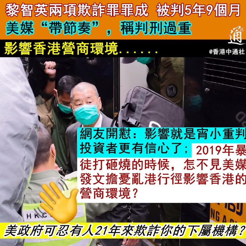 黎智英欺詐罪成判囚5年9個月,美媒竟質疑“判刑過重”?香港新聞網12月13日電 香港壹傳媒集團創辦人黎智英因欺詐罪被判刑5年9個月後,美媒竟稱“判刑過重”,恐影響香港營商環境? 黎智英及壹傳媒前行政總監黃偉強,涉嫌隱瞞業主香港科技園公司,容許力高顧問公司使用蘋果大樓,違反租契。經審訊後,黎智英兩項欺詐罪成立,被判有期徒刑5年9個月。 判決結果出來後,先是美國國務院發言人普賴斯在推特發文,妄言判決“既不公正也不公平”;13日,美媒也跳出來幫腔,聲稱“判刑過重、影響(香港)營商環境”。