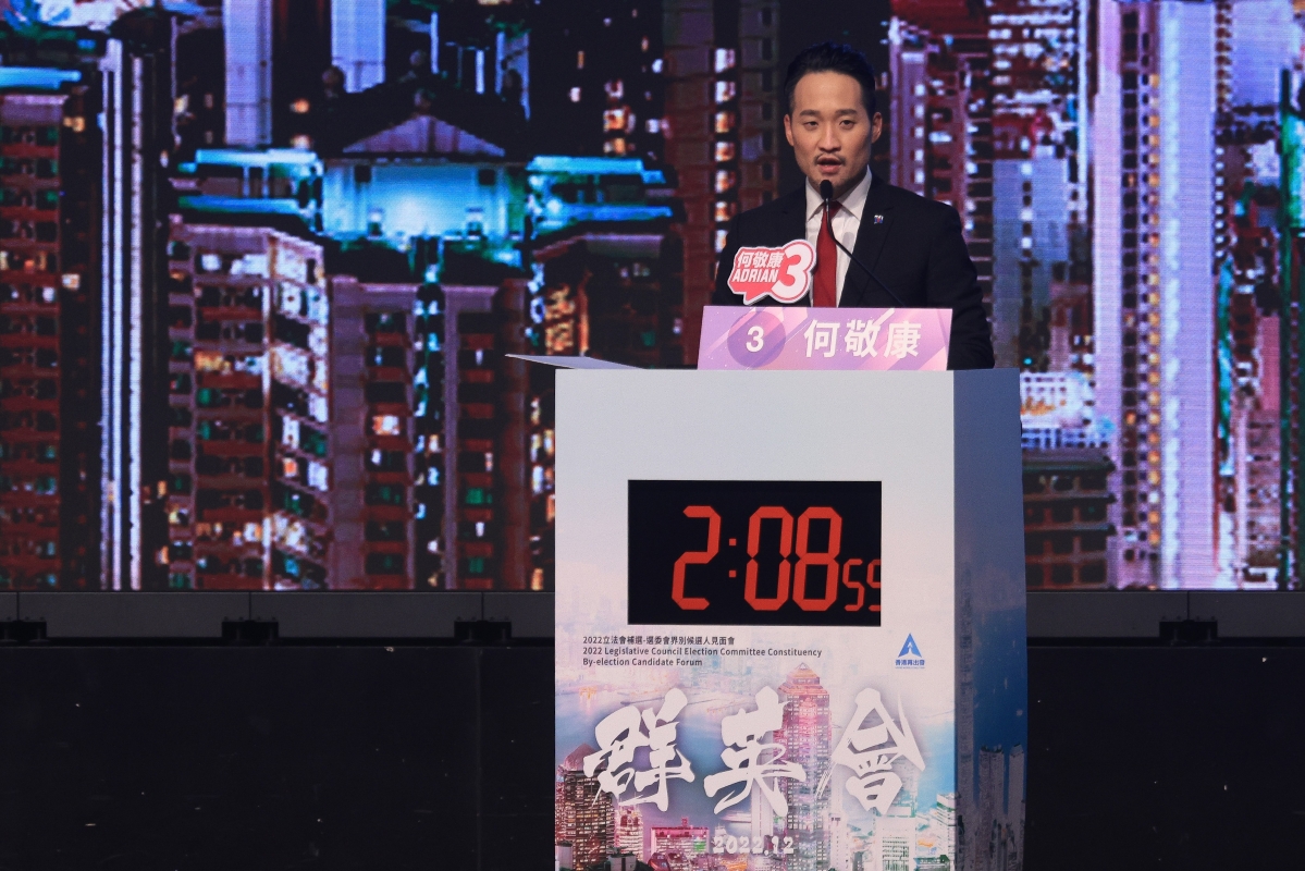 何敬康,候選人編號3,現年45歲,職業公司董事。新民黨成員、“Save HK”創辦人。競選口號為“砥礪前行”,希望加入議會繼續凝聚社會上理性聲音,聯繫支持中央及特區政府的正能量,又會到聯合國平台分享新疆營商的真實情況,說好中國及香港故事,令西方了解香港在“一國兩制”下會“行得穩、走得遠”。