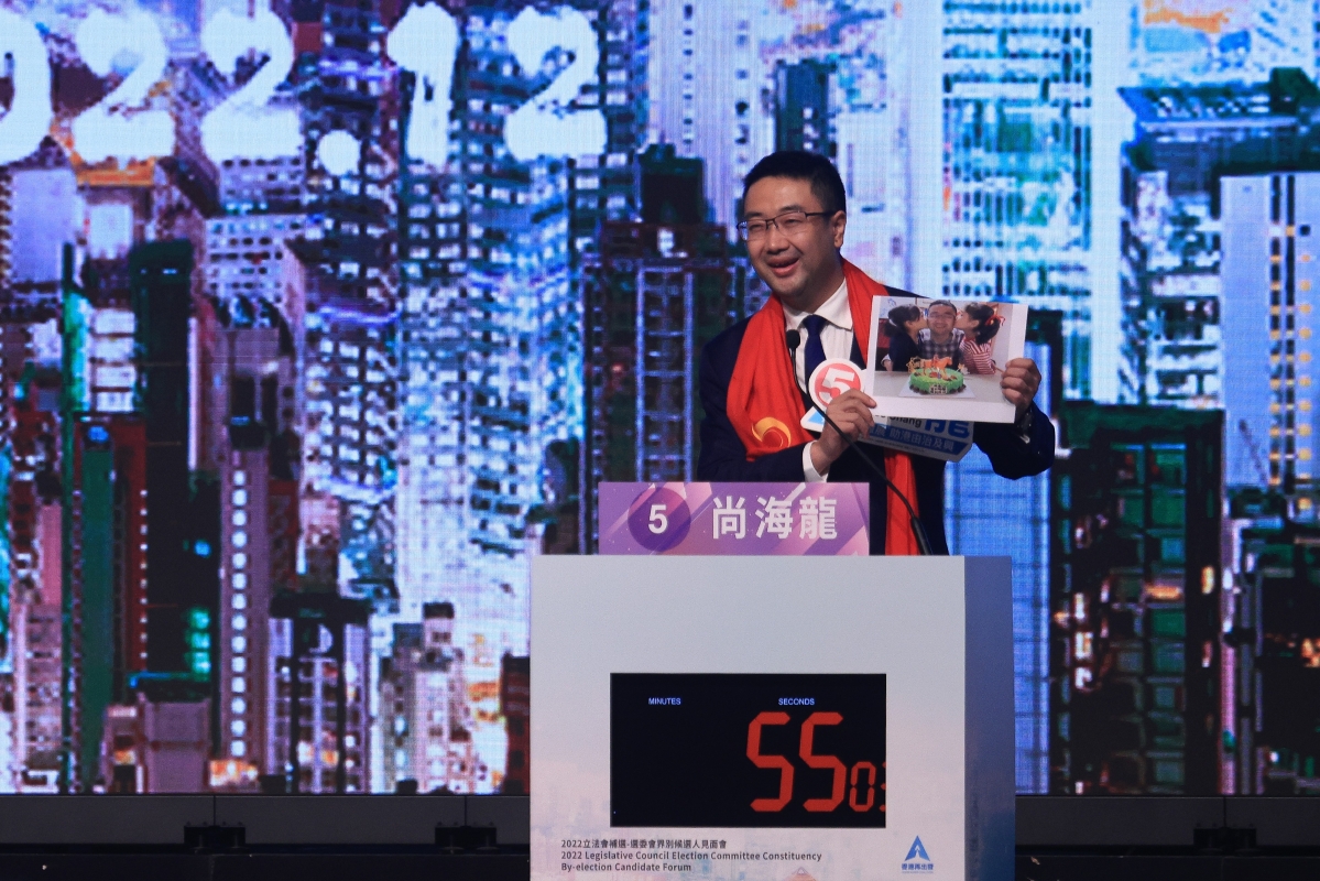 尚海龍,候選人編號5,現年40歲,職業企業管理者。獨立候選人、⾹港⼈⼯智能實驗室董事局成員兼執⾏董事、清華⼤學國家卓越⼯程師學院博⼠⽣、清華⼤學公共管理碩⼠、深圳市南山區政協常委、商湯科技⾹港公司總經理。他以“創科為港開新篇”為參選口號,主打“科創建港”,以推動創科發展助港由治及興,科創優勢引領香港融入國家所需、科創生態助力香港鞏固競爭優勢、科創教育營造青年發展美好未來、科創賦能協助政府提升治理效能。