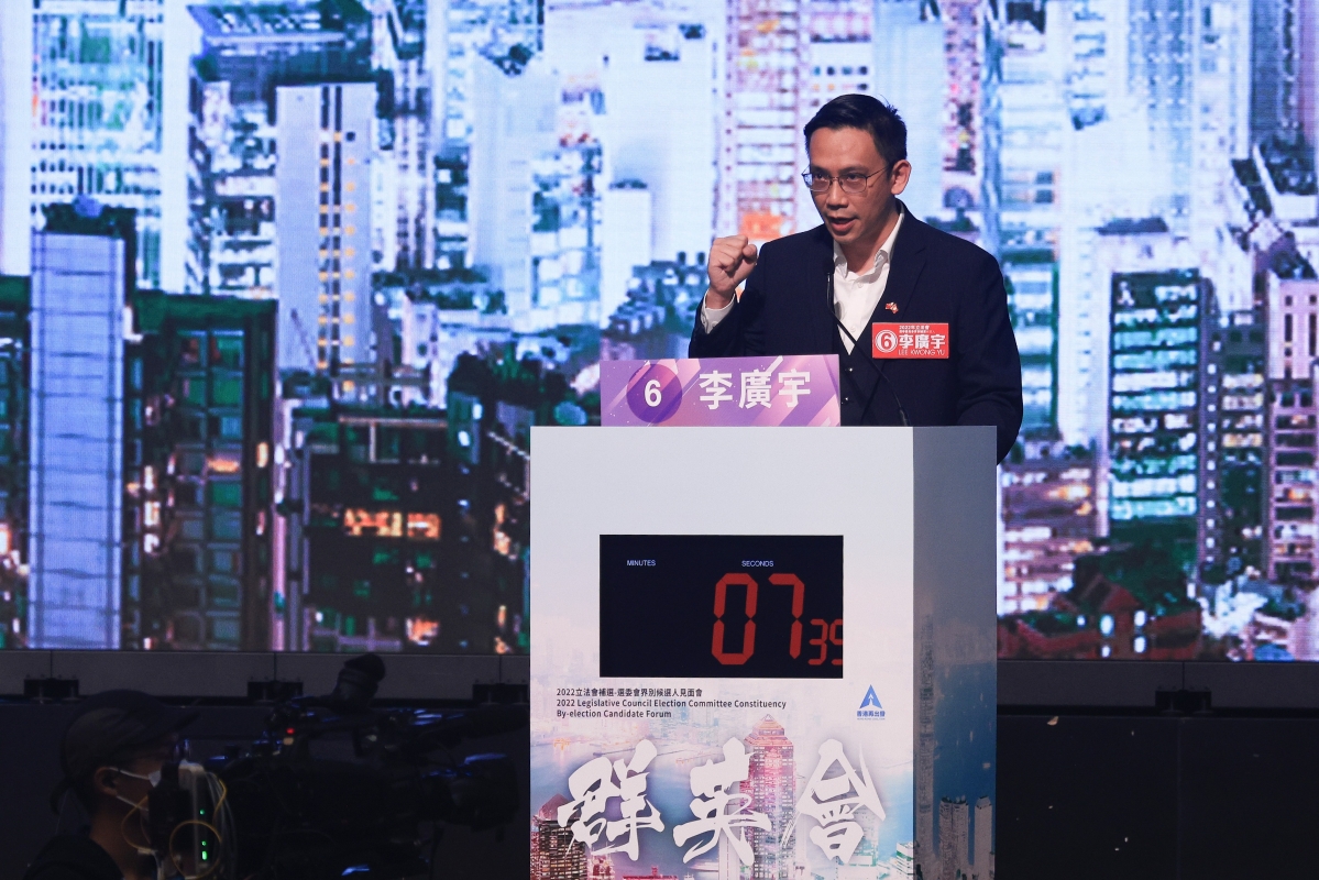 李廣宇,候選人編號6,現年44歲,職業數碼策略總監。工聯會成員、香港IT人協會理事長、權益委員會副主任。出身基層,覺得自己是年輕人可參考的對象,如何一步步向上流,未來會重視如何在港培訓不同人才服務香港。