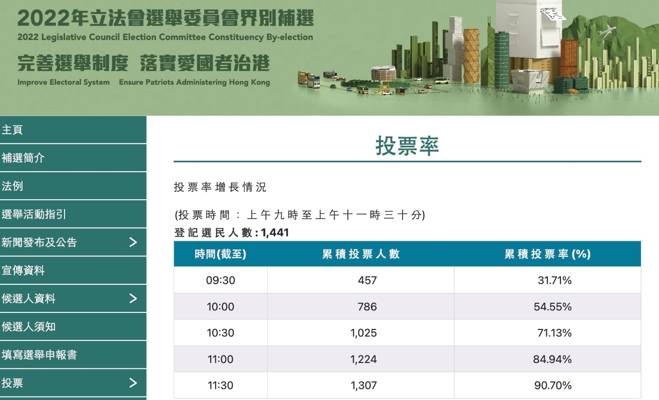 香港新聞網12月18日電 香港立法會選舉委員會界別補選12月18日舉行投票,投票時間為當天早上9時至11時30分。據官方統計資料,當天投票率為90.7%,1307名選委投出神聖一票。