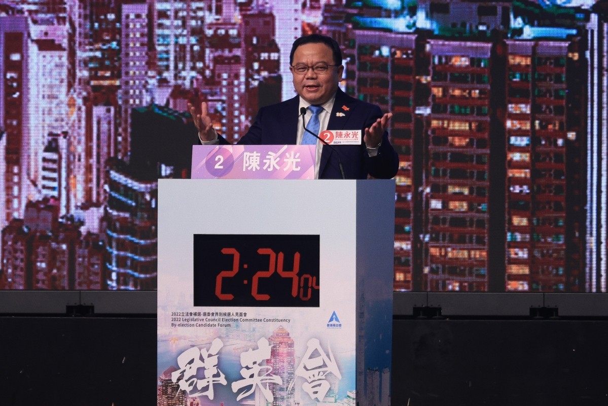 香港中通社圖片 六名候選人包括香港中文大學工程學院副院長黃錦輝、民建聯成員陳永光、新民黨成員何敬康、全國港澳研究會理事黃梓謙、商湯科技總經理尚海龍和香港工聯會成員李廣宇,他們分別獲得983、1028、833、791、812和781票。陳永光以1028票成為本次補選的票王。