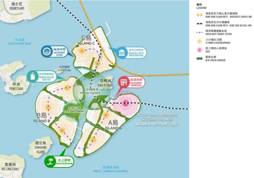發展局圖片。 另外,被問及新鐵路起點由屯門改為洪水橋,是否忽略屯門居民,劉國勳回應指,中部水域人工島只是整個明日大嶼計劃其中一部分,日後屯門西及龍鼓灘都會有其他發展項目,可以留待屆時再作研究。 出席同一節目的本土研究社成員陳劍青則指,政府計算成本時,未有計及未來20年的通脹,亦無計算相關基建的成本,加上填海深度較過去項目多出一倍,相信項目造價被嚴重低估。他續說,如果造價超出預期,會令公共資源減少,最終是市民受到影響。 根據政府提出的方案,初步建議1000公頃的交椅洲人工島,由兩島變為三個島嶼組成,興建約19萬至21萬個住宅單位,公私營房屋比例為7比3,容納50萬至55萬人口,提供27萬個就業職位。生活社區及核心商業區建議最高的住用地積比分別為6.5及7.5;其中較近港島的一個島,將設100公頃的核心商業區,合共提供約400萬平方米總商業樓面面積。 方案估計人工島私人住宅和商業用地賣地收入約為7500億港元,今年第二季的項目總工程造價粗略推算約為5800億港元,以近期市況及保守假設,土地收益仍高於工程造價;估計在交椅洲人工島全面發展後,相關經濟活動每年可帶來約2000億港元增加值,佔本地生產總值約7%。交通基建方面,會以15分鐘生活圈規劃7個社區,以環保集體運輸系統連接;興建港島西至大嶼山東北連接路,全長約13公里,將會是第一條無需經九龍來往港島和新界西北的主要幹道,建議於填海工程期間同步興建,爭取2033年完成。(完) 【編輯:孟宜君】