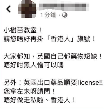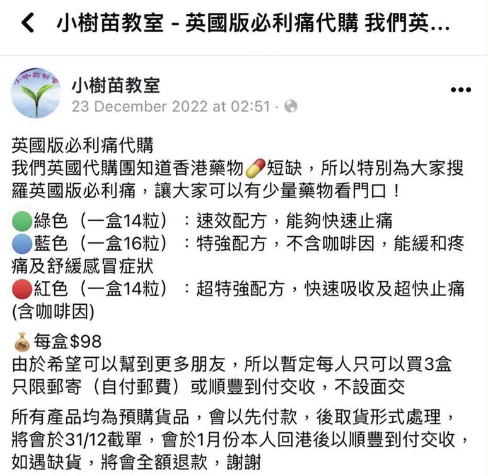 臉書截圖 該網友惺惺作態地說,“由於希望可以幫到更多朋友”,所以只能為每人代購3盒,每盒98元(港幣),又強調“所有產品均為預購貨品”,僅接受“先付款後取貨”,最後會由該網友本人回港後以郵寄到付的方式交收。 事實上,所謂香港止痛退燒藥“短缺”只是個別品牌藥品出現的短暫現象,公營醫療系統含“撲熱息痛”(Paracetamol)成分的止痛退燒藥的備存量充足。反而是英國在新冠疫情、冬季流感、甲型鏈球菌三重病毒夾擊之下,出現了“搶藥潮”,多地店鋪感冒和流感藥物的貨架空空如也。 因此,“黃絲”欲將英國緊俏的藥品賣到香港以賺取代購費,無異於動了其他身處英國、正面臨缺藥的港人的蛋糕。 沒過幾天,便有一位香港網友發帖怒批“小樹苗教室”,讓其 “不要再掛‘香港人’旗號”。該網友指出,“英國自己都藥物短缺”,“小樹苗教室”此舉實在“招人憎”,又警告道,英國出口藥品要license(許可證),質問對方“拿了沒”。“不好做走私啦,香港人!”該網友恨鐵不成鋼地批評道。