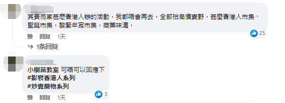 還有網友在評論區爆料,“小樹苗教室”此前已經打著香港人旗號,舉辦了一系列線下活動,如聖誕市集、年宵市集等,並在臉書專頁大力宣傳。該網友表示,這些市集上的商品“全部抬高價賣”“商業味濃”,直言自己“不會再去”。