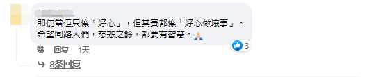 臉書截圖 也許是怕“小樹苗教室”的所言所行給英國人留下“壞印象”,在該條帖文下方,其他移英港人亦紛紛留言與“小樹苗教室”割席。 有“同路人”表示,即使當他是“好心”,“但都是‘好心做壞事’”,質疑“小樹苗教室”明明是為賺錢卻要“扮良心”,影響了香港人在海外的形象。