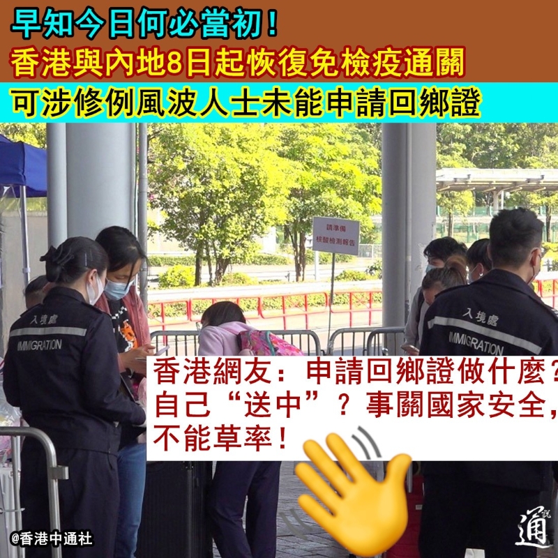 (製圖 劉春) 國家衛健委早前公布,2023年1月8日起入境只需持有出發前48小時內的核酸檢測陰性結果,入境內地後無需再接受核酸檢測和集中隔離檢疫。促成香港及內地逐步恢復通關。 不過,歷經3年疫情,部分港人的回鄉證已經過期或即將到期,需要辦理回鄉證續期申請。去年聖誕假期後的首個工作日,香港市民即紛紛湧入各中旅社申領回鄉證。 然而,曾經“反中”搞破壞的亂港分子卻因過往做的錯事,付出代價、難以北上內地,不禁讓人感嘆早知今日何必當初! 【編輯:刘春】