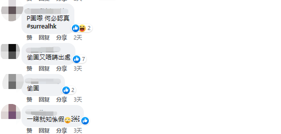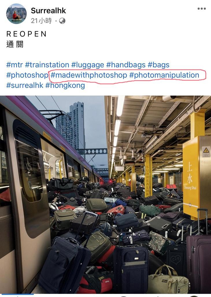 臉書截圖 該網友配文“Reopen 通關”,意圖醜化內地、暗示與內地“通關”後,鄰近跨境口岸的上水站會被內地訪港遊客的行李“擠爆”。不過該網友帶上了 “photo manipopulation(修圖)”“made with photoshop(由Photoshop製作)”的標籤,顯示該圖片並非真實拍攝畫面,而是由修圖軟件Photoshop合成的。 然而,這張別有用心製作出的圖片其後被另一位“黃絲”網友搬運到臉書討論組。這位“黃絲”網友卻故意省略了圖片出處以及“由Photoshop製作”的信息,僅配文“通關了,生意好呀!”,企圖引導圍觀網友將圖片當作真實的新聞畫面。 豈料,此波拙劣操作連圍觀的“黃絲”都不買賬,直言“一看就知道是假的”,並不滿搬運者“偷圖又不講出處”。