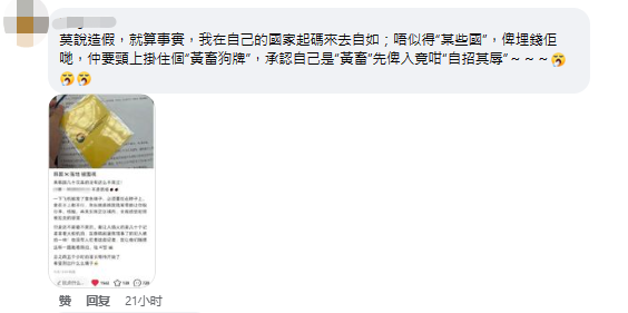 網友評論 “我在自己的國家起碼來去自如!”還有網友聯想到近日韓國政府針對中國旅客採取歧視性入境限制的新聞,諷刺“黃絲”對香港與內地之間的正常往來說三道四,卻願意入境韓國後“自取其辱”,“在脖子上掛上個‘黃牌’,承認自己是 ‘黃絲’。”
