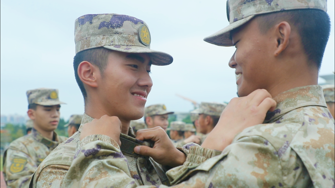 “現授予下列同志列兵軍銜......”在場領導宣讀了授銜命令,現場為新兵代表佩戴21式軍裝標誌符號,新戰士們將象徵著使命和榮譽的“一道拐”扛在了肩上。