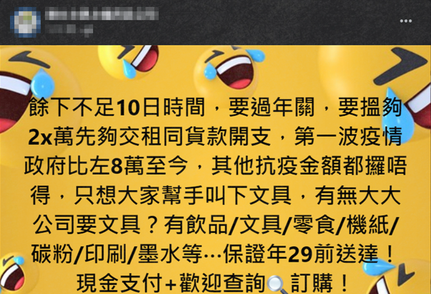 臉書截圖 為了博得“手足”同情,店家還“賣慘”稱,僅在第一波疫情時,收到特區政府補貼的約8萬元抗疫資金,此外其他抗疫資金“都攞(拿)不到”。 豈料,對於此番求助,早被所謂“黃色經濟圈”榨乾的“手足”並不買賬。在該帖文評論區,有“手足”直言“怎麼可能幫得了這麼多”,認為文具生意做不起來,還招呼“手足”“奉獻”20幾萬,建議店家直接“關店”。