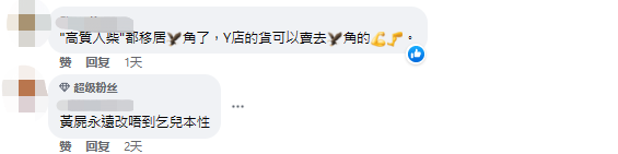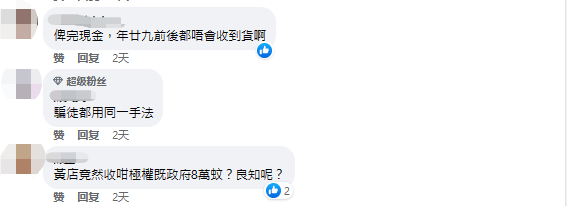 “手足”評論 也有“手足”替店家“翻譯”了一下帖文內容:“我都這麼‘黃’了,我差10萬,幫幫忙。”不滿其用生意“綁架”“同路人”。 或是眼見負面評論越來越多,店家其後刪除或隱藏了帖文。不過,仍不願錯過割“手足”“韭菜”機會的他們其後又重新發了一則帖文,未再提及要湊夠租金和貨品開支一事,並在結尾處“此地無銀三百兩”地強調了一句“不是眾籌款”。 相關帖文被網友截圖並於香港網絡流傳後,大批網友紛紛表示已經對“黃絲”“到處騙”的行為見怪不怪了。 有網友猜測,即便“手足”“給完現金,年二十九前後都不會收到貨”,並感歎這麼久了“黃絲”仍“不改乞討本性”,“用同一手法騙錢”。 也有網友諷刺稱,“‘高質人群’都移居英國了” ,“提醒”“黃店”應轉移市場、將貨賣到移英港人處。 此前,特區政府為了民眾生命健康積極採取防疫措施,被“黃絲”污衊為“極權”,而當政府派發了8萬多元抗疫資金時,“黃絲”卻暫時拋下 “反政府”立場,“違背良知”地全數收下。
