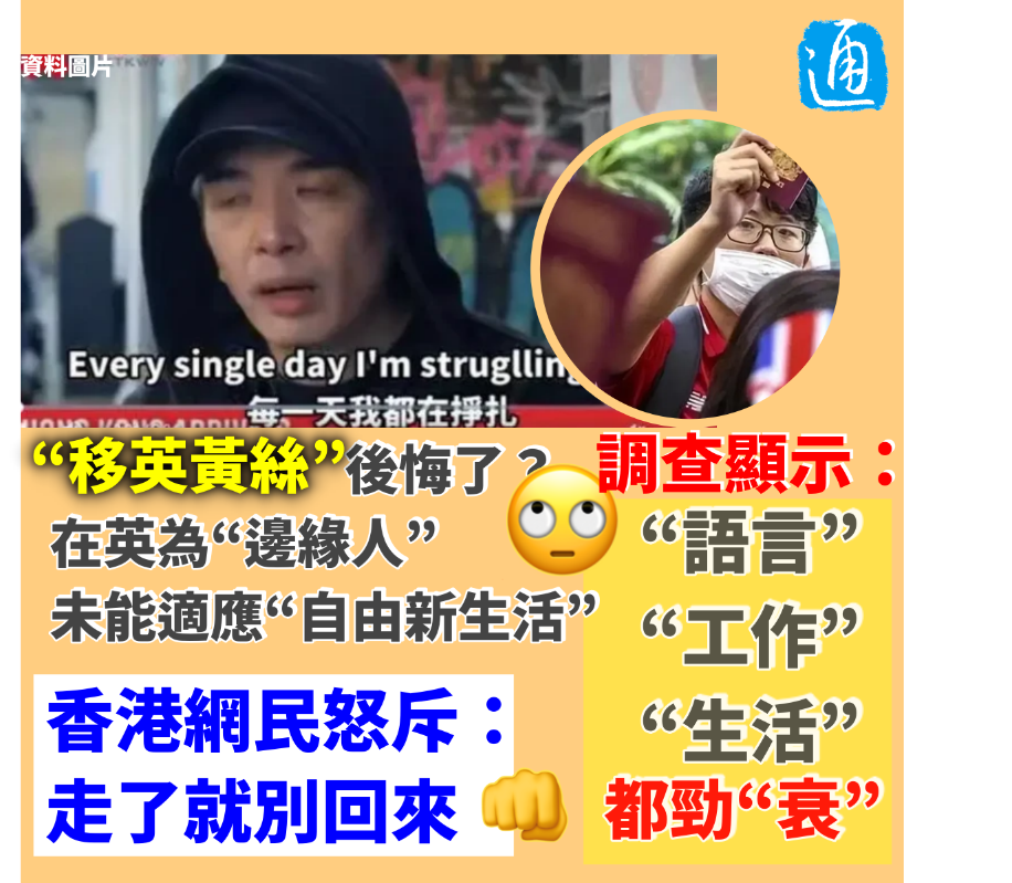 圖片製作:汪彥希 據美媒報道,在調查中,有三成受訪者表示仍未適應英國生活。大約一半受訪者指要想適應英國生活,有四項主要需求,包括了解英國社會習慣及融入社區、醫療服務、英語會話、工作機會及求職技巧。調查還發現,有約兩成受訪者表示,在生活開支上極度或高度需要幫助。BNO簽證申請者無法取回強積金(“強積金”在港工作者退休後返還到賬,或離港後永不返港者可以提取出來),亦影響他們的財政狀況。 香港積金局曾明確表示,“BNO護照不獲政府承認作為有效旅行證件和身份證明,亦不會在香港獲承認為任何形式的身份證明,因此強積金計劃成員不能依賴BNO護照或相關的簽證,作為申請提早提取強積金的證據。” 此外,逾半受訪者為學生或家長。調查顯示,這些人最關注的頭三個教育議題包括“如何承傳香港的文化/歷史”、“子女對新學習環境的適應”以及“大學學費”。政策顯示,BNO港人子女升讀大學,仍需交付國際學生學費,這與留港升學的支出相差甚遠...... 調查還邀請受訪者以文字寫下在英生活的感受,在460位願意留言的受訪者中,171位留言屬正面,卻有181位留言屬負面。這些負面留言者對移英生活的描述包括感到孤獨、不習慣英國生活、擔心個人財政與生活開銷、不適應冬天寒冷多雨及晝短的日子、語言障礙等問題。 可見,移英港人在異國他鄉的日子難捱,面臨的問題亦一籮筐,然而,亂港分子、“香港民意研究所”副行政總裁鍾劍華仍強行挽尊,妄言不少港人擔心子女在香港接受愛國教育,認為在未來一兩年移居英國的趨勢會持續。 這番言論實在引人發笑,有網友就指出,“香港人就是中國人,接受愛國教育有什麼不對嗎?” 此外,就不少移英港人卡在語言關一事,有網友就嘲諷這些持BNO移英的港人未看清形勢,就盲目移英,直言“英國人可不會慣著你來學粵語,亦如你們當初‘看不起’說普通話的人一樣。” 眼見持BNO簽證港人移英後並未過上“民主自由”的生活,反而因缺乏英國政府及“手足”的援助過得灰頭土臉,有香港網友就擔心這些人在英國混不下去又會厚著臉皮回流香港,直言“香港不是垃圾站,希望港府拒收。” “做人要有骨氣,不要像無頭蒼蠅一樣,到處亂撞!”還有網友喊話移英港人。 值得注意的是,在有關調查中,近半受訪者還妄稱是因為香港的政治環境移居英國,超過兩成稱是因為自由或人身安全考慮。就此,移英的香港“學者”黃偉國總結說,16歲到70歲以上的受訪者都認為政治環境是主要因素,因此在調查結果以“政治難民”作主題。 2019年香港發生“修例風波”,“ 黃絲”暴徒大張旗鼓“搞事情”,打砸搶燒,包括在各大高校放火設路障,挑起嚴重暴力活動,隨後又為避免負上刑責,以“政治庇護”為幌子潛逃英國。把香港搞亂後,後續這些搞事“黃絲”竟倒打一耙,稱“香港政治環境不好,安全無法得到保障”,持BNO簽證移英。 把香港搞臭的是這些人,說不安全的又是這些人……不過,現時英國面臨通脹、罷工等問題已是泥菩薩過江,自身難保,廣大香港市民亦越發看清那些所謂“政治難民”的嘴臉,移英“黃絲”“賊喊捉賊”的把戲恐玩不久矣! 【編輯:汪彥希】