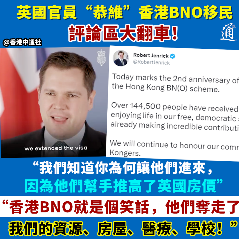 英國官員“恭維”香港BNO移民,評論區大翻車!香港新聞網2月2日電 英國政府本想“恭維”香港BNO移民,令更多持BNO港人“帶錢移英”,豈料遭本國公民狠撕、評論區大翻車! 英國為持英國國民(海外)護照(BNO)的香港居民開放新簽證已經兩周年。英國內政部分管移民事務的國務大臣羅伯特·詹里克昨日(2月1日)在社交平台推特發文,聲稱逾14萬港人持BNO簽證在英國開啟了新生活,對英國社會“貢獻良多”。 該推文亦附上一條視頻,企圖展現香港BNO移民融入英國社區的“和諧”畫面。詹里克在影片中形容,香港BNO移民為英國國家醫療服務體系(NHS)工作、幫助阿富汗和烏克蘭難民以及在私營機構工作等,“許多香港人形容,在英國居住就像回家了一般。”希望未來有更多合資格的港人移英。