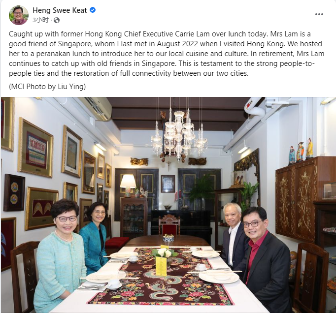 王瑞杰2日在社交媒體分享與林鄭月娥及其丈夫林兆波吃午餐的照片。他指,上次見到林鄭月娥是在2022年8月訪港的時候。林鄭月娥卸任後,仍繼續與新加坡的老朋友聚舊,這說明了兩地之間的聯繫以及全面連通性恢復。(完)
