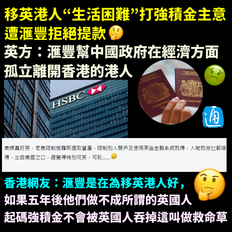 圖片製作:汪彥希 想著“辦法總比困難多”,這些移英港人又把目光投向自己的“故土”香港,算計著還有一筆強積金未取出,遂打起提前提取強積金的主意...... 強積金是香港特區政府在2000年12月實行的一項政策,旨在保障退休人士的生活。根據法例,計劃成員年滿65歲時可選擇以一筆過或分期的方式提取強積金,或保留在強積金計劃內繼續投資。若要提早於65歲前提取,需符合6種特定情況,包括年滿60歲提早退休、永久性地離開香港等。 據美媒8日報道,英國國會一個委員會8日發表一份報告,稱根據提供給英國會跨黨派香港小組的證據,滙豐銀行以英國政府提供的入境文件不充分為由拒絕向移英港人發放強積金。並指責“滙豐幫中國政府在經濟方面孤立離開香港的港人。” 英國自由民主黨議員、國會香港小組主席阿利斯泰爾·卡邁克爾(Alistair Carmichael)更妄稱,事件不僅關乎法律,更關乎使用自己財產的個人基本權利。 滙豐銀行則通過聲明回應稱,他們尊重人權並且“與所有銀行一樣,我們必須在我們開展業務的每個地區遵守法律和監管機構的指示。” 翻查資料,香港積金局曾發聲明指出,鑑於特區政府已在2021年1月29日發表聲明表示不承認BNO護照作為有效旅行證件和身份證明,亦不會在香港獲承認為任何形式的身份證明,因此計劃成員不能依賴BNO護照或其相關的簽證作為申請提早提取強積金的證據。 積金局強調,強積金受託人在執行強積金計劃行政工作時,有責任依據香港法例行事。受託人在處理以“永久性地離開香港”為由而提早提取強積金的申請時,必須擔當把關者的角色,審視申索人所提供的證據,及檢視全部事實和資料。 可見,滙豐銀行是依照法律辦事,作法合法合理! “香港的滙豐銀行就要守香港的法律!”不少香港網友獲悉事件後,亦怒斥英方干預香港事務,並揭穿他們插手BNO一事的背後心機:“英國最重視香港BNO移民的銀行戶口存款,每滴都要榨乾。” 也有香港網友揶揄:“滙豐是為香港BNO移民好,如果5年後,香港BNO移民做不英國人,起碼都還剩強積金沒被英國人侵吞,這叫救命草。” 【編輯:汪彥希】
