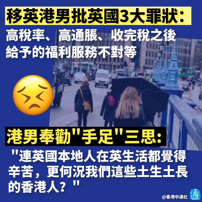 香港新聞網2月14日電 “高稅率”、“高通脹”、“收完稅之後給予的福利服務不對等”……港人移英後力數英國社會3大問題,還奉勸“手足”三思? 近日,有港人僅移居英國數月,便發文哭訴這幾個月來的生活“令人沮喪”! 該移英港人在Facebook群組“英國香港人生活交流區”發文,稱日前與在外地生活20多年、近年返回英國的鄰居聊天。期間雙方談及在英國生活的艱苦,英國鄰居抱怨剛被裁員,現在還在找工作,哀歎“現在的英國和20年前完全不同,現在的生活好艱苦!”該港人還稱,鄰居認為在這種情況下舉家移英的香港人“很勇敢”。 隨後,該移英港人亦“心有戚戚焉”地列出英國3大問題,即“高稅率”、“高通脹”以及“收完稅之後給予的福利服務不對等”,直言在這裡生活“令人好沮喪”! 與英國鄰居交流後,似乎更磨滅了移英港人的幻想。 “連英國本地人在英生活都覺得辛苦,更何況我們這些土生土長的香港人?”該移英港人忍不住在帖文中發出靈魂拷問。 最後,在異國他鄉吃盡苦頭的該港人呼籲“手足”移民英國前一定要想清楚!“還沒來的香港人,請看清楚英國現在生活的難處,或者等到英國恢復低通脹,生活能恢復正常時再考慮動身。”
