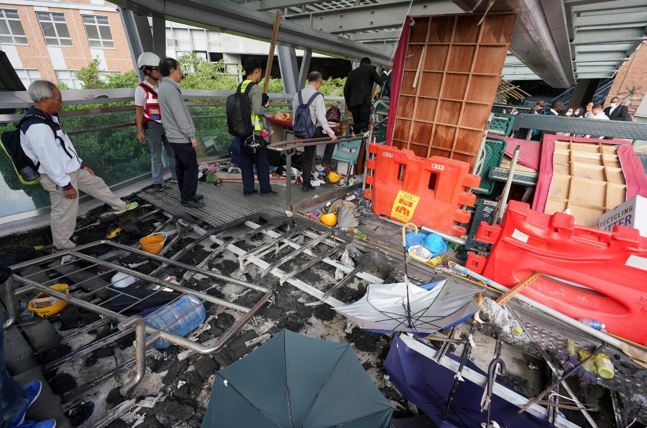資料圖:圖為被破壞的香港理工大學行人天橋。圖源:香港中通社 案情指,2019年11月17日晚,警方設防線全面封鎖理大,連同被告等17人於翌日早上8時企圖逃離理大,衝向當時暫停向公眾開放的香港科學館停車場時,被警員發現及拘捕。 法官裁決時指出,被告自稱義務急救員,但只有初步急救知識,義務急救員只是迷惑人的說法;被告只是為占領者服務,又跟隨他人離開理大,明顯是害怕被捕,遂裁定被告兩項暴動罪成。 同案另外3名被告,年齡介乎26至30歲,早前承認暴動等罪,被判監16至19個月。(完) 【編輯:馬華】