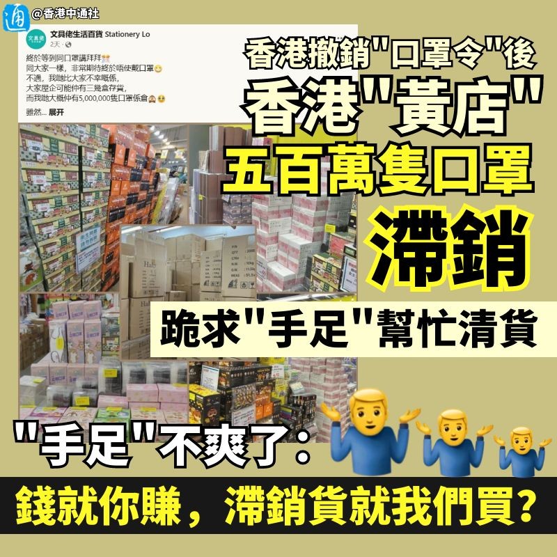 香港中通社製圖 然而,面對“黃店”看似“誠意滿滿”的清貨請求,曾經的“手足”也並不買賬了! 有網友嘲諷在疫情平穩的今天還有店家囤500萬隻口罩相當離譜。“港府一早吹風會取消口罩令,為什麼還會有這麼多存貨?應該一早減價散貨了!好明顯不會做生意。”另一名網友回覆該留言時道出“黃店”不顧時局囤貨的真相——因為他們想著不管囤積多少貨,最後“會有手足幫手”!