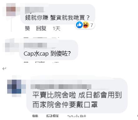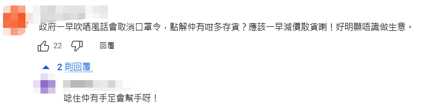 網友評論 “錢就你賺,滯銷貨就我們買?”有香港網友不爽“黃店”把“手足”當成冤大頭,怒斥疫情期間店家賣口罩獲得豐厚利益,現在虧了一些錢卻要“手足”買單! 還有網友指出街頭有藥房大減價清倉,口罩僅賣10元一盒,還免費派發快測棒,而 “文具佬”還要賣30元至50元一盒,質疑其利用最後機會掠水“手足”。 網友紛紛建議,若真為清倉,可以便宜一點賣給院舍,或者捐給清潔工、第三世界國家有需要的人等等。