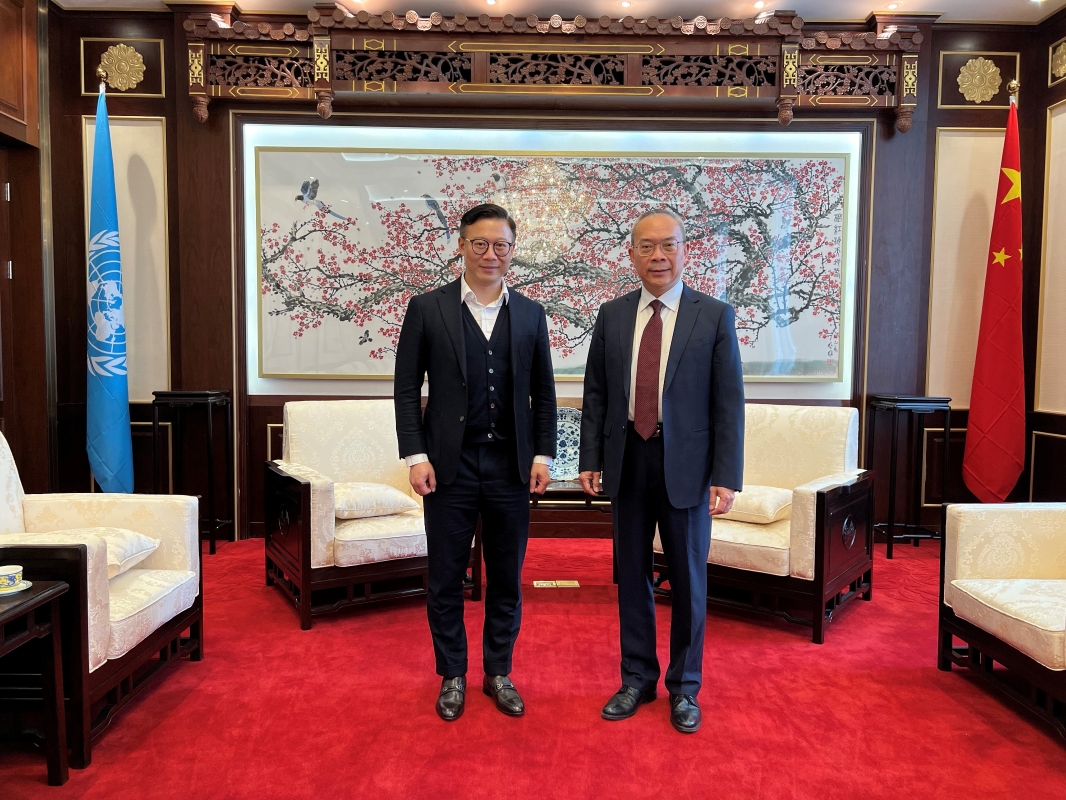 張國鈞(左)在奧地利維也納拜會中華人民共和國駐奧地利共和國特命全權大使亓玫(右)