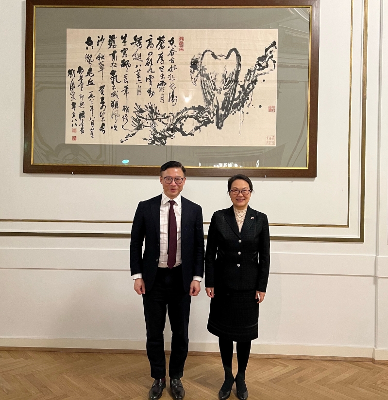 張國鈞(左)在奧地利維也納與聯合國國際貿易法委員會秘書長Anna Joubin-Bret(右)會面。 聯合國貿法委是聯合國系統中在國際貿易法方面的核心法律機構,五十多年來致力推動全球商法改革,協調各種國際商業規則並使之與時並進。該組織近年與律政司一直緊密合作,包括設立普惠全球法律創新平台探討網上爭議解決,促進有關網上爭議解決議題的研究。 張國鈞提到,律政司非常重視與國際私法領域三大最頂尖國際組織的合作,當中包括聯合國貿法委,故此律政司於香港復常後首次外訪亦選擇到訪該數個組織,以深化雙方合作。 他感謝聯合國貿法委一直支持與律政司之間的人才借調計劃,讓香港律政司人員能在聯合國參與貿法委工作,增進國際法律事務的專業知識,加強香港涉外法治建設方面的能力。 他亦欣悉由律政司借調的法律人員熟識普通法,對聯合國貿法委工作發揮積極作用,他強調這正好體現香港在“一國兩制”下的獨特優勢。 張國鈞亦拜會中華人民共和國常駐聯合國維也納辦事處和其他國際組織代表、特命全權大使李松,以及中華人民共和國駐奧地利共和國特命全權大使亓玫,介紹香港法律方面的最新發展,並把握機會了解聯合國和奧地利各方面的最新情況。