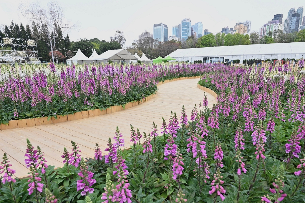 圖示中央大草坪新增的一大片毛地黃花海,毛地黃一串串鐘形花冠極具特色,花形優美,相信是花展另一熱點。 花展另一亮點是每晚7時30分及8時30分上演的燈光音樂匯演,會場中軸線的園林造景結合燈光和音樂效果,在夜幕下另有一番景象。
