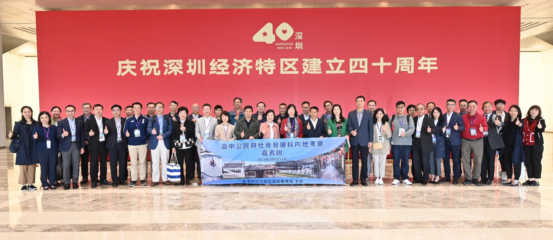 圖示蔡若蓮(右一)和教育局常任秘書長李美嫦(右三)與其他訪問團成員在深圳前海國際會議中心參觀“慶祝深圳經濟特區建立四十周年展覽”。 在國家教育部港澳台辦副主任舒剛波及廣東省教育廳一級巡視員朱超華陪同下,訪問團先到訪深圳前海國際會議中心。他們參觀“慶祝深圳經濟特區建立四十周年展覽”,認識深圳的發展成就,以及深圳在粵港澳大灣區的發展優勢。