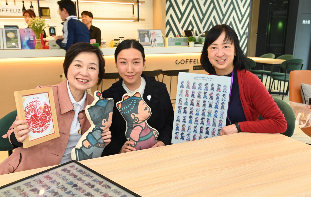 圖示蔡若蓮(左)和教育局常任秘書長李美嫦(右)與其中一名來自香港的青年及其設計作品合照。 他們隨後到訪前海深港青年夢工場,了解其創建理念及基礎建設,包括創業學院和創業園,同時探討香港青年在前海發展的機遇。 下午,訪問團轉抵廣州,參觀位於南沙的明珠灣開發展覽中心,認識南沙的規劃概念和發展前景,以及在大灣區建設發揮的重要角色。他們其後到訪陳家祠和永慶坊,分別參觀非物質文化遺產和粵劇藝術博物館。