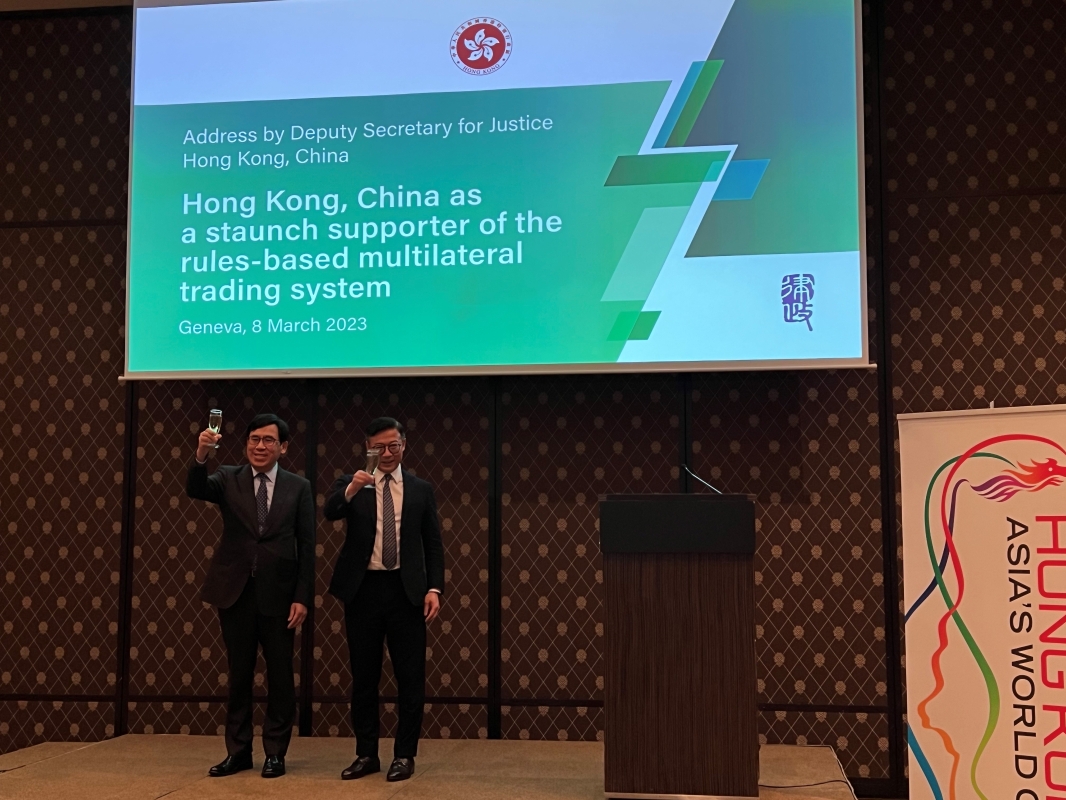 圖示張國鈞(右)和中華人民共和國香港特別行政區駐世界貿易組織常設代表羅志康(左)一同主持祝酒儀式。 他致辭時重申,中國香港一直堅定支持以規則為基礎的國際貿易體系,曾參與世貿不同成員提起的多起爭端,包括針對美國對鋼鋁進口徵收的關稅及相關措施提起的訴訟,協助釐清世貿法的重要法律原則,加強成員對國際貿易法的理解。 他特別提到,就中國香港訴美國有關產地來源標記規定的事件中,世貿爭端解決機構專家組裁定美國的相關規定不符合《關稅與貿易總協定1994》中最惠國待遇的要求,並全面否定美方援引有關安全例外條款的聲稱。該裁決充分肯定中國香港在世貿組織中作為單獨關稅區的地位。 此外,張國鈞亦推廣香港的法律和爭議解決服務,表示在香港國安法實施以後,香港的投資和營商環境得到穩定及變得更有生機,他鼓勵企業和機構落戶香港,充分利用在“一國兩制”下,香港作為中國境內唯一實行普通法制度的司法管轄區所提供的獨特優勢和機遇。 酒會前,張國鈞到訪世貿法律支援中心,與中心行政總裁Niall Meagher和其他高層管理人員會面,就加強世貿法律支援中心和律政司的合作交換意見。
