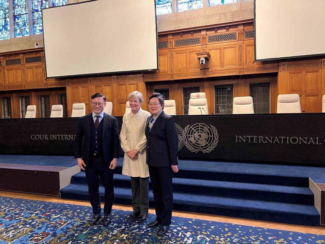 張國鈞(左)與聯合國國際法院法官薛捍勤(右)和法官Hilary Charlesworth(中)於荷蘭海牙的國際法院合照。 他表示,香港作為亞太區國際法律和爭議解決服務中心,十分着重培訓法律人才,並將繼續致力舉辦各類能力建設活動和學術研討會,期望國際法院法官能在這些活動中分享他們的真知灼見。