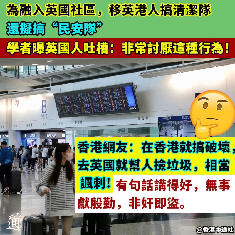 香港新聞網3月16日電 在英國社區搞“清潔隊、民安隊”,移英港人葫蘆裡賣的什麼藥? 香港紀惠集團副主席及行政總裁湯文亮近日在社交平台發文爆料,有年輕朋友到公司辭行,透露計劃移民英國。鑒於近年屢屢傳出港人難融入英國社區的消息,為規避此類問題,該朋友心生一計,欲組織清潔隊伍,定時清理當地社區的公用地方;若當地治安不好,則聯合其他移英港人組織所謂“民安隊”...... “我聽完後嚇了一跳。”未料,此大計竟叫湯文亮不喜反驚。他隨後反問這位年輕人,如果有朋友到家中做客,是否願意客人清潔自己的家呢?答案顯然是不願意! “所以,到埗後要適應社區生活,盡量不改動社區內的生活方式,否則就會令人討厭。”湯文亮語重心長地告誡有意移英的港青,又稱自己不時在網上瞥見一些移英港人曬出的清潔當地社區的照片。然而,這些移英港人“引以為豪”的大作卻慘遭英國人的吐槽……