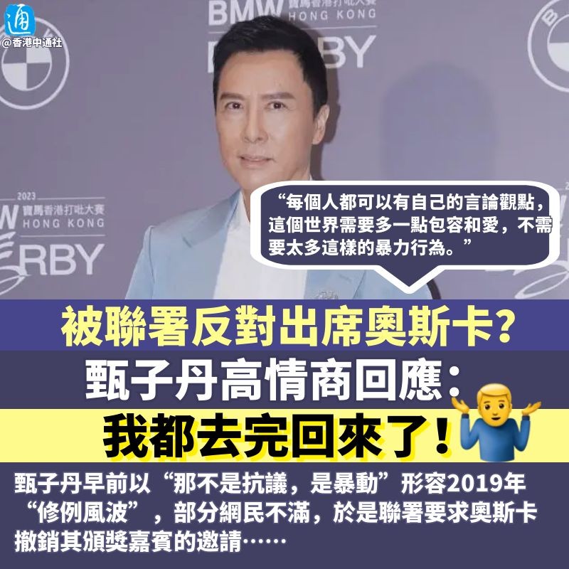 香港新聞網3月20日電 早前,香港演員甄子丹接受外媒訪問時以“那不是抗議,是暴動”形容2019年“修例風波”,遭部分網民發起聯署,要求奧斯卡撤銷其頒獎嘉賓的邀請,不過最後甄子丹仍然按原計劃出席頒獎典禮。對此,甄子丹昨日(19日)以“打吡大使”身份現身沙田馬場時,高情商回應:“我都已經從奧斯卡回來啦!” 被問及遭部分網民聯署反對出席奧斯卡一事時,甄子丹表示:“我都已經從奧斯卡回來啦!每個人都可以有自己的言論觀點,這個世界需要多一點包容和愛,不需要太多這樣的暴力行為。”