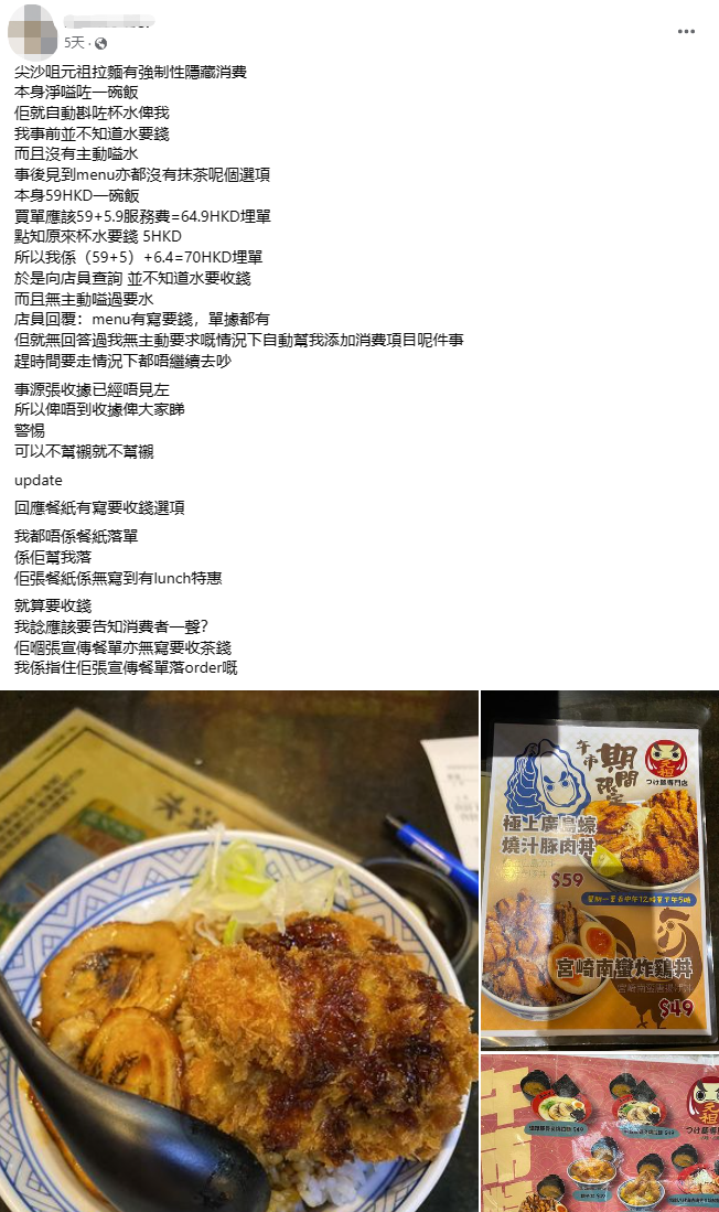 臉書截圖 面對食客質疑,店員則解釋說,點菜紙和單據上都有表明水並非免費。但該網友指自己未有經點菜紙下單,認為店員有責任預先提醒客人,而不應在客人沒有主動要求的情況下自動為其添加消費項目。 最後,該網友提醒大家“警惕”該間拉麵店的“強制隱藏消費”,直言“可以不幫襯(光顧)就不幫襯”。 翻查元祖沾麵專門店的社交平台專頁,發現該店於三年前香港“修例風波”期間曾公開支持所謂“罷工罷市”活動,獲一眾“手足”認證為“黃店”。 香港“修例風波”發生後,不少“黃店”走起邪門歪道,妄圖用偏激的政治立場吸引“手足”幫襯獻金,卻懶理店內的食物質素。而“手足”在硬著頭皮啃下“黃店”的“貴價”食物後,這次再面臨“強制隱形消費”這樣的“割韭菜”行為,終於忍無可忍了。