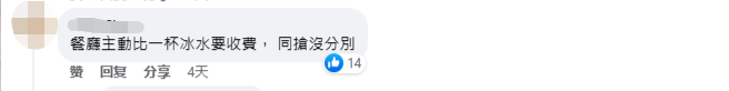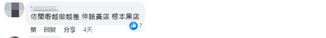 “同路人”評論 這條意在讓眾多“手足”“避雷”的貼文一出,立即引起大量同路人留言回應。有人哀歎該店店員主動給一杯水然後收費的行為“和搶沒分別”。 “越做越差。”有“手足”批評該店不只是“黃店”,更是“黑店”,直言要“抵制”這類“想盡辦法剝削消費者”的餐廳。 還有“手足”對“黃店”貪婪的行徑感到後怕,猜測下次或會“收冷氣費、座位費、餐具費、音樂費……”
