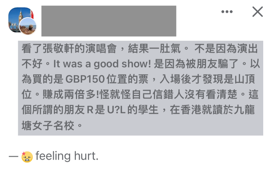 香港新聞網3月22日電 日前,一位身在英國的香港網友在社交平台臉書發帖,吐槽在倫敦看張敬軒的演唱會,結果看出“一肚氣”。原因並非演出不行,而是該網友沒想到,竟然被“手足”誆騙、在自己人身上栽了跟頭! 該網友形容,本以為從朋友那裡買了一個好位置的票,結果入場後才發現竟是“山頂位”,懷疑被朋友“賺了兩倍多”。 “怪就怪自己信錯人沒有看清楚。”事後,該網友坦言“感覺受傷”,惱怒之下,更曝光了對方的部分身份信息及其在英國和香港分別就讀的學校名稱,希望 “同路人” 警惕,別再受騙。