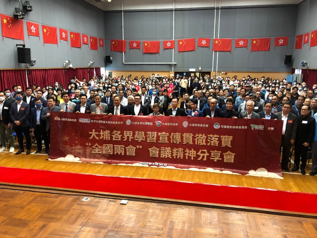 大埔民政事務處於3月30日聯同新界社團聯會大埔地區委員會、大埔各界大聯盟、大埔各界協會、大埔青年協會、大埔鄉事委員會和西貢北約鄉事委員會在大埔社區中心舉辦“大埔各界學習宣傳貫徹落實“全國兩會”會議精神分享會”。圖示嘉賓和與會者出席分享會。