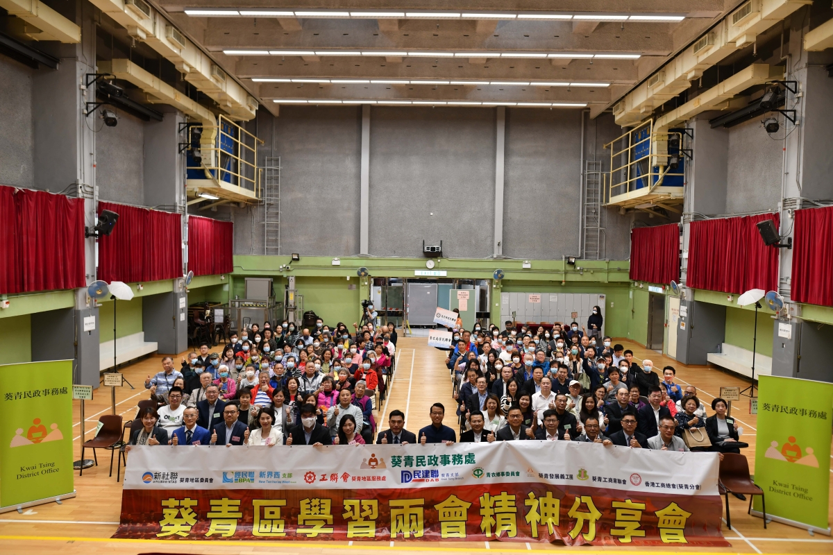 青民政事務處3月31日聯同新界社團聯會葵青地區委員會、香港經濟民生聯盟新界西支部、香港工會聯合會葵青地區服務處、民主建港協進聯盟葵青支部、青衣鄉事委員會、葵青發展義工團、葵青工商業聯會、香港工商總會(葵青分會),在長發社區中心舉辦“學習‘全國兩會精神’分享會”。圖示嘉賓和與會者出席分享會。
