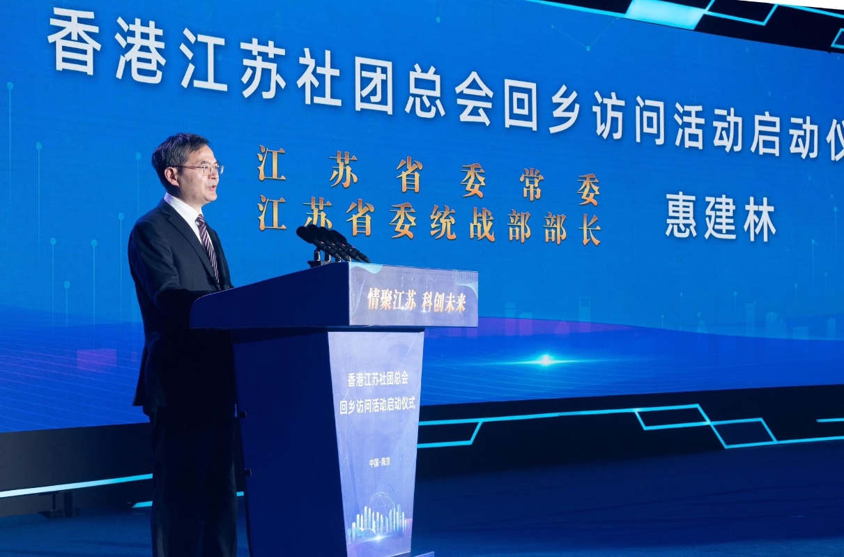 江蘇省委常委、省委統戰部部長惠建林致辭。他代表省委對香港江蘇社團總會回鄉訪問團表示歡迎。他指出,長期以來,香港江蘇社團總會廣泛團結凝聚在港江蘇鄉親,堅定擁護“一國兩制”和基本法,堅決擁護特區政府依法施政,為維護香港社會繁榮穩定、促進蘇港兩地交流合作作出了積極貢獻。希望香港江蘇社團總會和廣大旅港鄉親繼續高舉愛國愛港旗幟,為推動“一國兩制”實踐行穩致遠貢獻力量;一如既往地關心、支援、參與江蘇建設,進一步推動蘇港各領域、各層面、各行業交流合作;繼續發揮熟悉海內外市場、瞭解兩地文化的優勢,支持江蘇全方位提升對外開放水平。