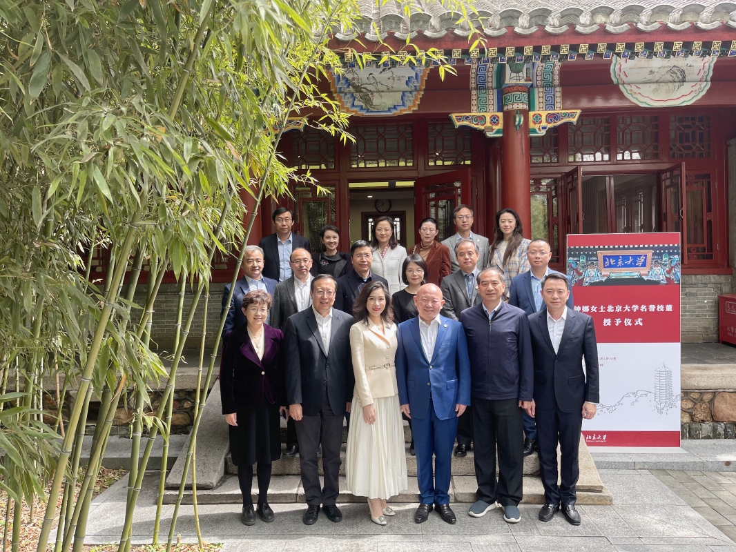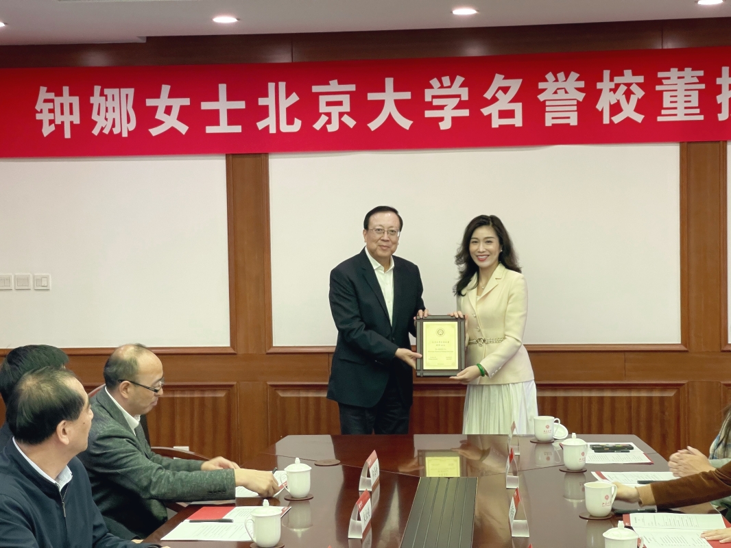 北京大學黨委書記、教育基金會理事長郝平向鍾娜頒授名譽校董銅牌。(圖源:大公文匯全媒體) 北京大學常務副校長、醫學部主任喬傑代表北大師生對圓中集團表示感謝。她表示,在新的發展階段,國家把教育、人才、科技作為“三位一體”戰略發展的重要方向,北大將繼續擔當起中國高校排頭兵和領頭雁的職責,為國家發展和民族復興不斷奮鬥、再立新功。她續指,名譽校董是北大授予最重要的各界賢達和友人的一個崇高榮譽,期待鍾娜、袁福林兩位董事長能以自己的遠見卓識和豐富的社會經驗,繼續參與北大的發展和建設。 “北大自創立之初就與中華民族的命運緊密相聯,承擔着培養國家棟樑之才的歷史重任,肩負着中華民族偉大復興的光榮使命。多年來,我一直夢想能以個人的綿薄之力,為北大的建設發展、為國家的教育事業貢獻一份力量。今天,北大師生讓我實現了夙願。”鍾娜表示,圓中國際與北大有着長期的友好交流和互利合作,共同致力於推動教育事業的發展和創新,下一步將積極支持北大的教學、科研、人才培養等各項事業。“北大一定能培養造就更多具有國際水平的戰略科技人才和高水平的創新團隊,在前瞻性研究、引領性原創等方面取得更多重大成果。”