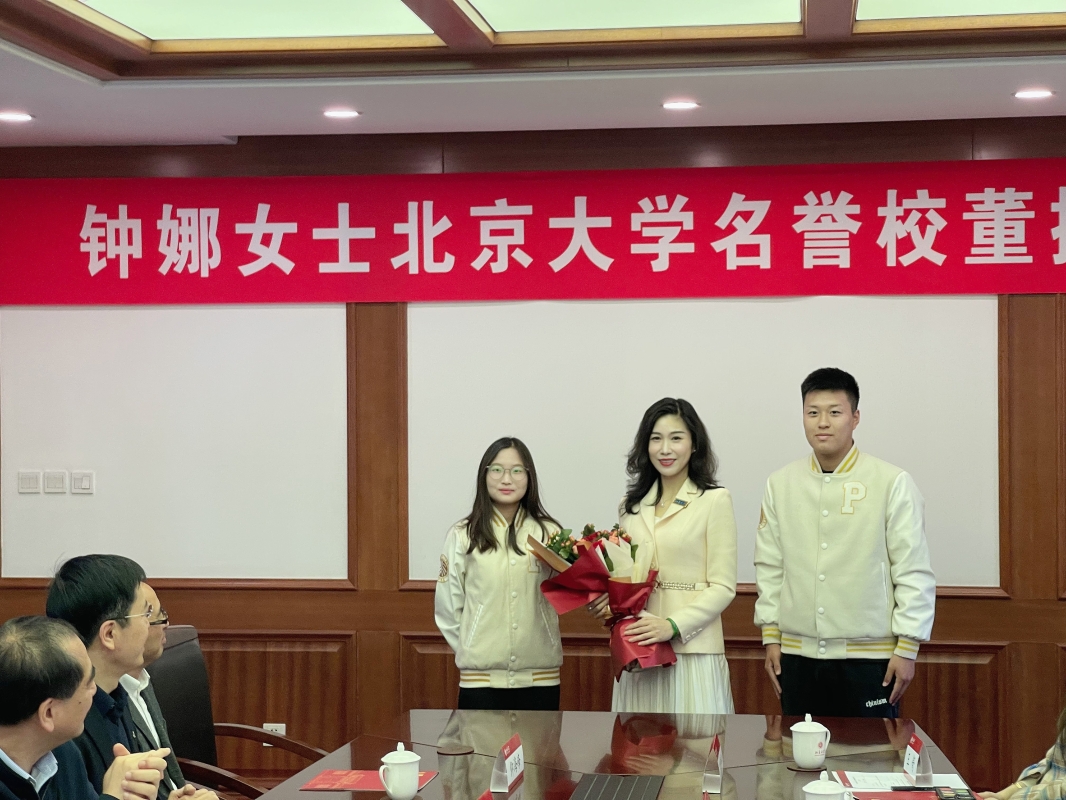 (鍾娜女士北京大學名譽校董授予儀式10日在北大臨湖軒舉行。圖源:大公文匯全媒體) 據大公文匯全媒體報道,在北京大學臨湖軒舉行的授予儀式現場,北大黨委書記、教育基金會理事長郝平向鍾娜頒授名譽校董銅牌,校長龔旗煌向香港圓中集團有限公司董事長袁福林致贈感謝狀。學生代表為鍾娜校董佩戴北京大學校徽並獻花。