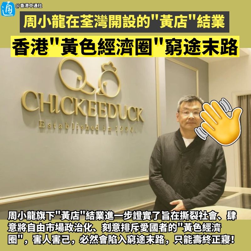 香港新聞網4月11日電 香港國安法頒布後,社會恢復安定。曾靠“反中亂港”立場收割“手足”韭菜的“黃店”遭到越來越多港人唾棄,陸續收檔。這幾天,又一家名頭在外的香港店鋪宣告結業,“黃色經濟圈”已窮途末路…… 曾在店鋪擺放所謂“香港民主女神”雕塑、鼓勵渣打馬拉松跑手穿上印有“香港加油”服裝的Chickeeduck老闆周小龍昨日(10日)在社交媒體發文,表示當日是其在荃灣開設的“藝術生活百貨”最後一日營業,隨即結業。 人在英國的周小龍還不忘用小恩小惠討好“手足”,稱將把店內衣架、相架、購物袋及傢私送出。又蠱惑“手足”“保持憤怒”,被認為意在挑動部分港人繼續“抗爭”。 更可笑的是,由於自家店鋪“不受歡迎”只能“執笠”(結業),周小龍卻強扯是政府“荒謬打壓”,嘴硬稱,“今日他們有權,但是我們有人,有我們在這裡,他們永遠都不會得到大多數市民的支持……”