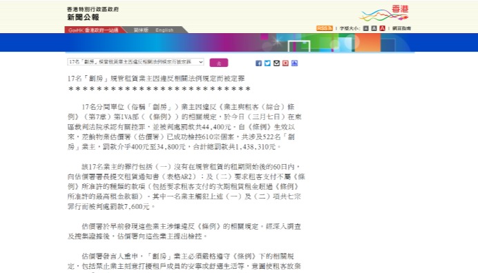 香港新聞網4月14日電 香港劏房租務管制條例去年生效,截至今年2月,只有2宗違規個案被成功定罪,有議員14日在立法會財委會特別會議上建議提高罰款金額。特區政府房屋局局長何永賢指,上月有多1宗個案被成功定罪,罰款過萬港元;紀律部隊人員亦加緊執法,正加大罰則。 差餉物業估價署表示,目前1308宗個案中,有1274宗屬租戶向當局查詢期間主動識別,有380宗個案的租戶拒絕提供資料。何永賢指,每宗個案情況不一,會根據證據和律政司意見提出起訴。 劏房租務管制條例在去年1月22日生效,訂明租期、租金、租住權保障等規定,如業主不得向租客濫收雜費、租期內租金不得上調等。首宗案件中,業主因濫收水電費和沒有提供租金收據等被判罰款共6600港元。(完) 【編輯:徐嘉儀】