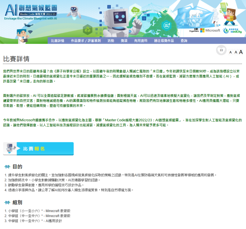 圖片來源:香港教育城官網 “Master Code編程大賽”得到各界高度的評價及學校的踴躍支援,本屆以應對氣候變化為主題,旨在提升學生對氣候變化的關注,並加強對各國現時就氣候變化採取的策略之認識;加強教師及中、小學生對數據驅動決策、AI及機器學習的認識;鼓勵學生發揮創意,應用所學的編程技巧設計作品;以及透過分享得獎作品,讓公眾了解AI如何改善人類生活環境質素。 比賽分為3個組別,包括:小學組(小一至小六)-Minecraft教育版、中學組(中一至中六)-Minecraft教育版及中學組(中一至中六)-AI應用設計,每隊需由2至4名學生組成。評審團由各專業團體的成員組成,根據主題訊息、編程技巧及AI運用、創意、團隊合作等準則進行評審。 “Master Code編程大賽”自2016年舉辦至今,深受學界歡迎,每年吸引不少精英參賽,學生們激發想像,貼心地改善人類生活,例如“Master Code編程大賽2021:AI構想∙智健康生活”,小學組冠軍聖安多尼學校以Minecraft編程建“智慧醫院”,藉以解決現實缺醫護困境、“Master Code編程大賽2020:AI起動.智啟零饑餓未來”中學組冠軍的迦密主恩中學通過機械學習方式分析害蟲,消除饑餓危機。 AI應用具備龐大潛能,只要敢創敢想,隨時扭轉未來,中小學生請把握機會報名,截止遞交參賽 作品日期為5月29日,有關比賽詳情,請瀏覽網址:https://www.edcity.hk/coding/zh-hant。(完) 【編輯:崔靜雯】