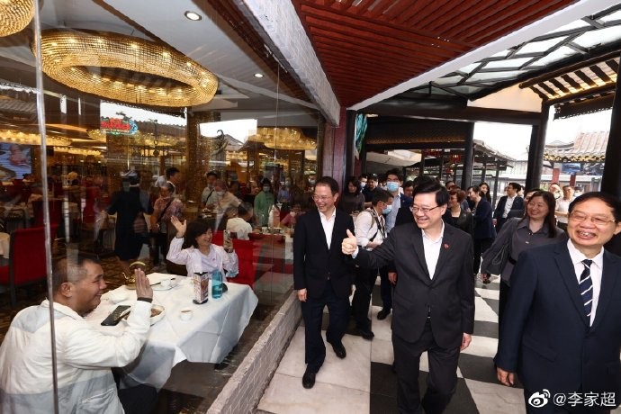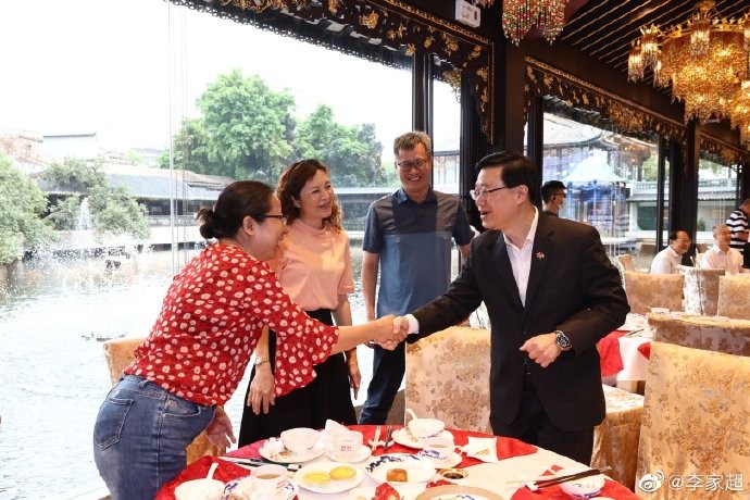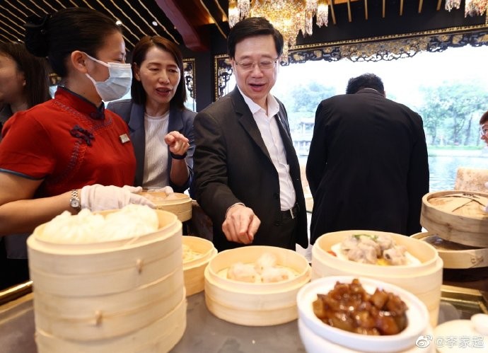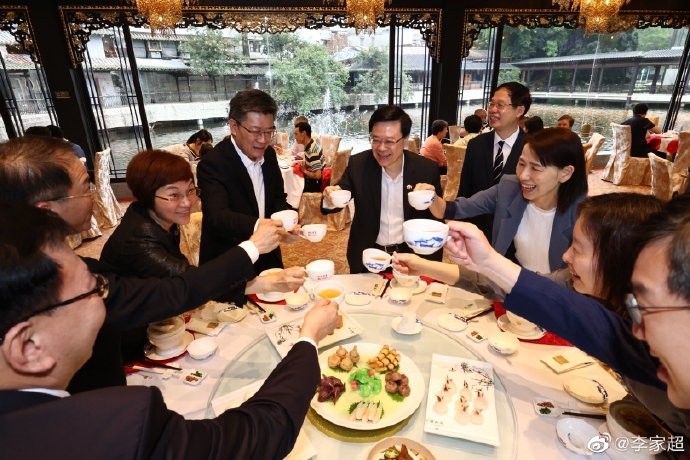 (李家超與廣州市市長飲早茶 圖源:李家超微博) 酒家座落在荔灣湖公園畔,是全國最大的老字號園林酒家。李家超稱,在該店飲早茶,令人感到十分愜意;水滾茶靚,一盅兩件。大家知道我是番禺人,還特別安排了番禺傳統點心“市橋白賣”,讓我倍感親切!並詢問大家喜歡吃什麼點心? 據悉,訪問團將於今天下午結束行程,乘坐高鐵返回香港。(完) 【編輯:刘春】