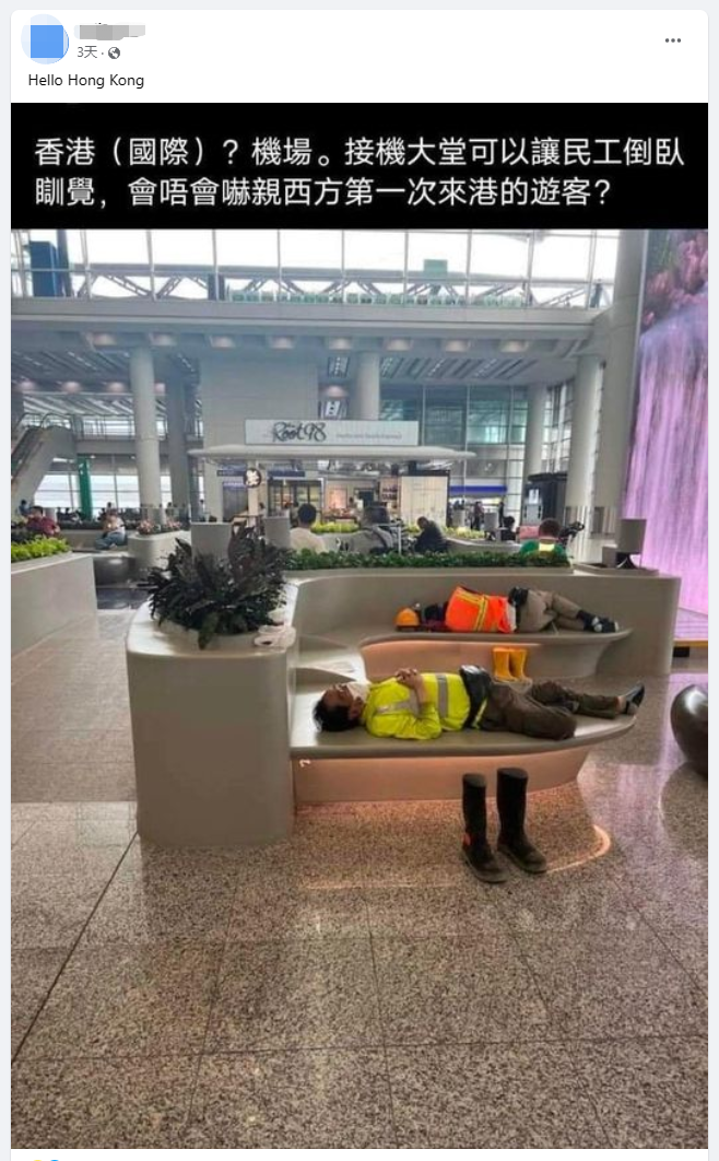 香港新聞網4月24日電 香港“黃絲”無視他們“癱瘓機場”的擾民行徑,反對辛勤工作的地盤工於機場睡覺的行為進行公審? 日前,一位網友將一張於香港機場偷拍的建築工人休息照片,上傳到社交平台臉書的一個群組內。從照片可見,幾位身著工作服的地盤工人脫了鞋躺在接機大堂的座位上。 雖然,相中的工人並無明顯違反公共場所規定的行為,卻仍遭到該發帖者責難。發帖者對於在香港國際機場上演“脫鞋睡覺”的場景感到驚訝,稱接機大堂允許“民工倒臥睡覺”,“會不會嚇壞西方第一次來港的遊客?”