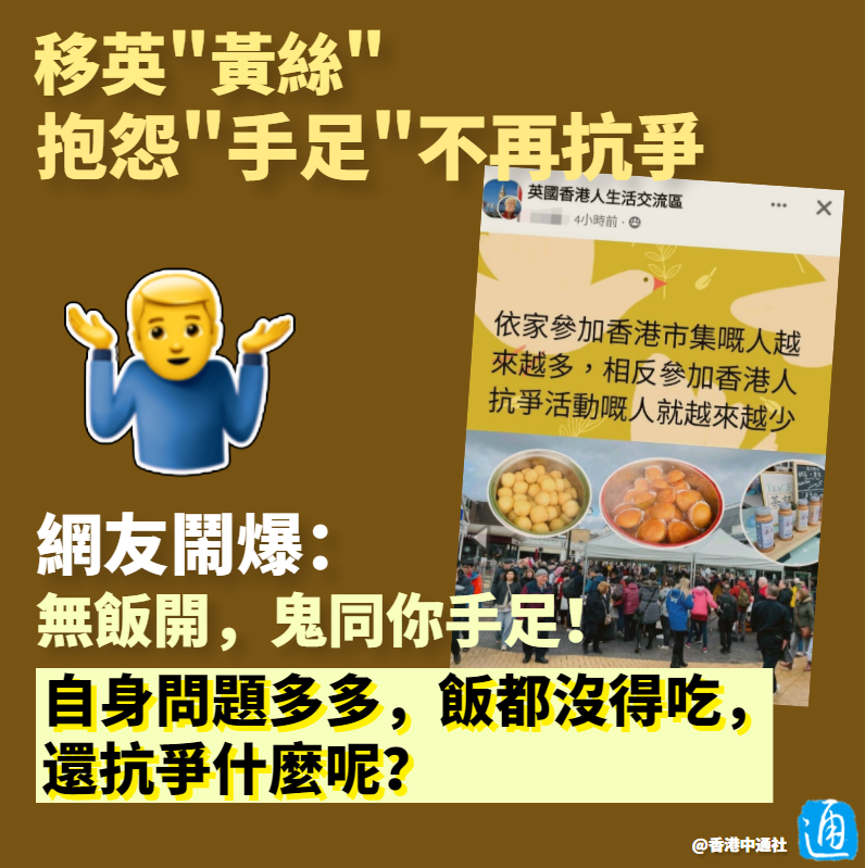 香港中通社製圖 不過,眼明心亮的香港網友也不吃“黃絲”這一套了! 有網友怒斥移英“黃絲”精神分裂:“香港早已恢復正常生活了,不知道這些人到底要抗爭什麼?” 有網友直言“黃絲”移民至英國,早已無立場插手香港事務——“移民去英國,都已經不再是香港人,還向香港特區政府抗爭,抗爭上腦嗎?”不過就有網友在該留言下方調侃說這班“黃友”雖移民海外但仍“心繫香港”,因為他們仍保留香港身份證,在英國待不下去的時候準備隨時回流香港! 有網友嘲諷所謂“手足”的“抗爭”,不過是拿錢演戲罷了!“之前有錢派,現在無錢派,當然無人去。” “自身問題多多,飯都沒得吃,還抗爭什麼呢?”“無飯開,鬼同你‘手足’!”有網友指出,現在英國通脹高企、生活成本飆升,當地多個行業陸續罷工,移英港人在當地賺錢艱難,哪有時間搞“政治抗爭”呢?所以移英港人舉辦一些小型市集,賣港式美食和小紀念品,在圍爐取暖之餘,更是可以賺錢貼補家用。 香港社會早已風平浪靜,個別“黃絲”卻亂港之心不死,妄圖挑動風波。但事實上,大多“手足”早已看清“黃圈”本質,移英生活不順的他們也不再願意理睬無意義的所謂“抗爭”,只想過好自己的生活。 【編輯:李冉】