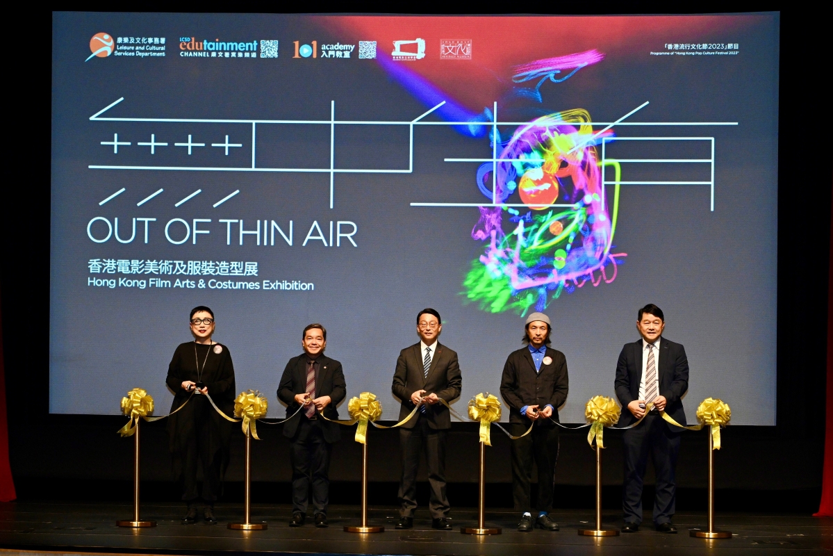 圖片來源:政府新聞網。圖示(左起)香港電影美術學會副會長劉天蘭;博物館諮詢委員會歷史專責委員會主席莫家豪教授;康樂及文化事務署署長劉明光;香港電影美術學會會長文念中和香港文化博物館總館長林國輝在典禮合照。 展覽是“香港流行文化節 2023”節目之一,會透過一系列經典服飾造型、道具、場景設計、手稿圖、行業用具、影片及重構工作間等,引領觀眾走入電影幕後世界,探視香港電影美術專業的建立過程,並認識香港電影文化的特質,以及電影工作者靈活變通的專業精神與兼容並蓄的創作特色。